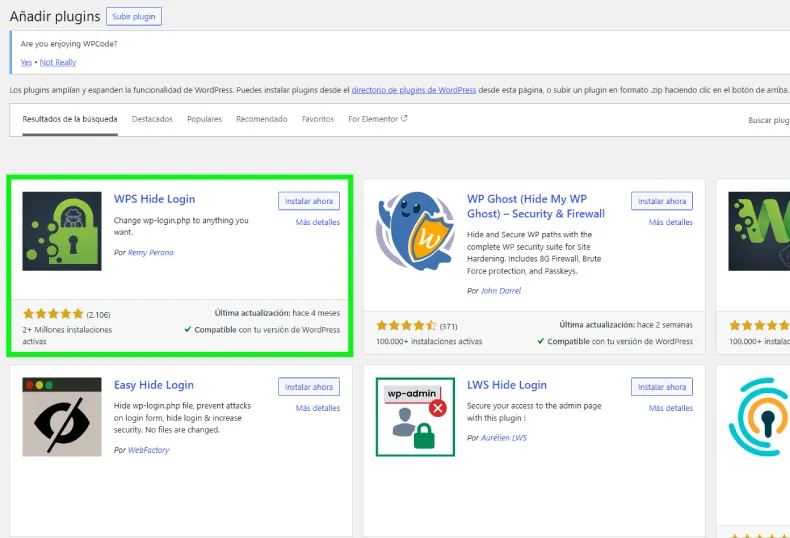 - Ve al panel de WordPress: Plugins > Añadir nuevo y busca “WPS Hide Login”.